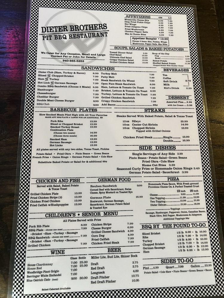 As a food reviewer of Yumhhub, I am excited to introduce you to Dieter Brothers Restaurant, located at 401 E Hwy 82 Lindsay, TX 76250. This restaurant offers a variety of cuisines including barbeque, desserts, and pizza.
